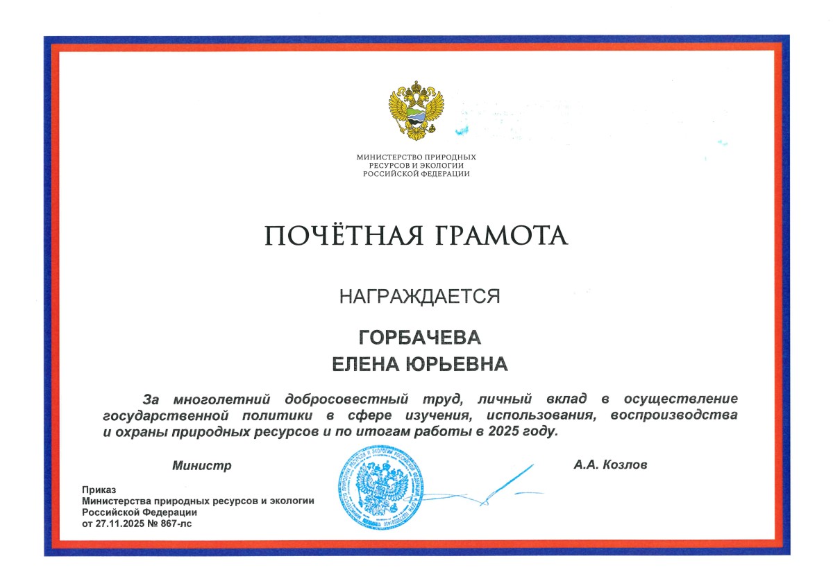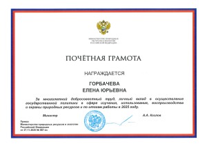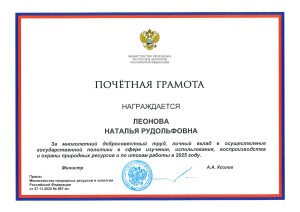 За многолетний добросовестный труд, личный вклад в осуществление государственной политики в сфере изучения, использования, воспроизводства и охраны природных ресурсов и по итогам работы в 2025 году награждены Почётной грамотой Минприроды России Горбачева Елена Юрьевна, директор Западно-Сибирского филиала ФГБУ «Авиаметтелеком Росгидромета», и Леонова Наталья Рудольфовна, директор Уральского филиала ФГБУ «Авиаметтелеком Росгидромета».