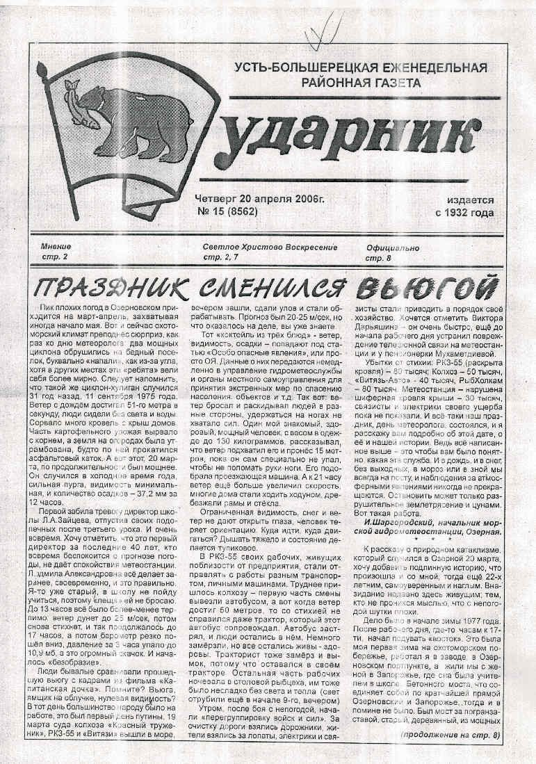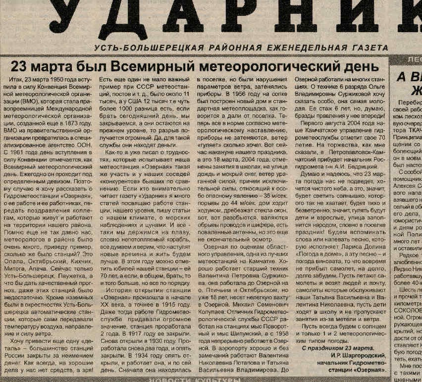 Несменным начальником ГМС Озерная более 40 лет (с 1970 по 2015 год) являлся Шаргородский И.Р. Именно благодаря ему с завидной регулярностью в еженедельной газете Усть-Большерецкого района «Ударник» выходили заметки о метеоявлениях и работе метеостанции.