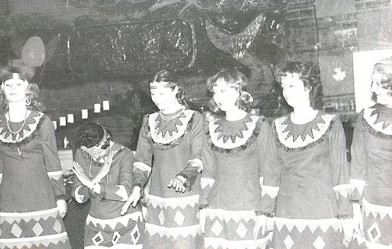 Фото 4. Коллектив АМСГ Корф отмечает Новый год, 1984 год (техник-метеоролог Карасева Валентина, инженер-синоптик Редько Тамара, техник-метеоролог Ромашова Зинаида, радиооператор Задорожная Наталья, радиооператор Меланич Валентина)