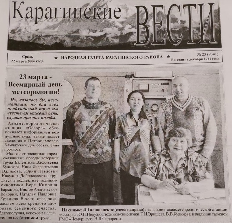 Фото 6. Статья в газете «Карагинские вести» от 22.03.2006, посвященная Всемирному метеорологическому дню, коллектив АМСГ Оссора